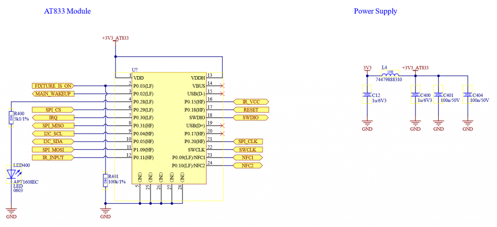 The following circuit shows a example implementation for the AT833 Module. This Module is available on request info@kk-t.de. Each pin and its functionality is described in the table below.