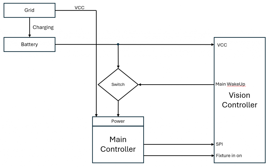 A block diagram of the schematic for the Vision Controller regarding power supply and state inputs may look like this if it is a battery supplied fixture:
