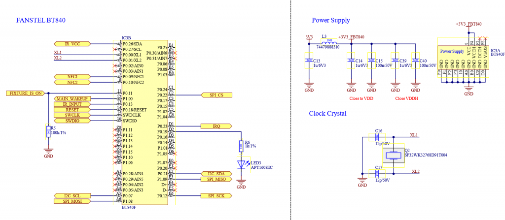 The following circuit shows a example implementation for the Fanstel BT840 Module. Each pin and its functionality is described in the table below.